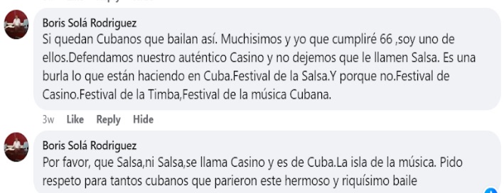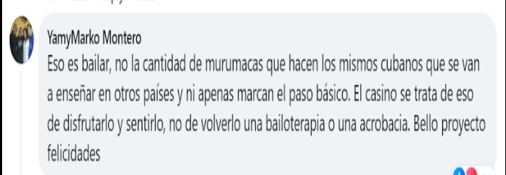 Mientras leía todos los comentarios y absorbía lo que estaban diciendo, me di cuenta de algo: Los cubanos no hablan en línea en contra de lo mal o con la falta de autenticidad con el que se baila el casino fuera de Cuba por no cubanos, o incluso por maestros cubanos. No por lo general, al menos. En cambio, los cubanos sí comentan cuando ven la verdadera esencia del baile en la pantalla, cuando se ven reflejados en el baile. Cuando ven a otros bailar casino respetando la forma en que se baila en Cuba. Ahí los cubanos destapan la olla.