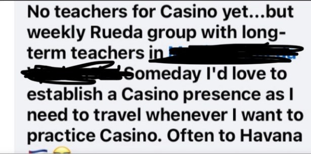 No es culpa de esta persona estar confundida. El grupo al que asiste la ha desinformado… porque informar sobre la cultura no era el objetivo del grupo; era crear comunidad. Ahora esta persona piensa que la rueda es un baile separado del casino. Este es otro ejemplo de por qué las buenas intenciones no son suficientes al decidir crear un grupo de baile cubano. Tienes que saber lo que estás haciendo.
