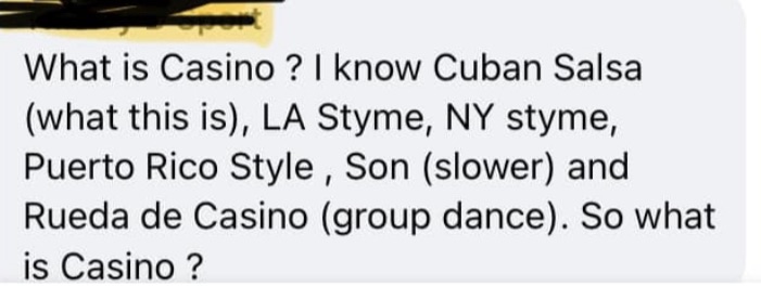 No es culpa de esta persona estar confundida. El grupo al que asiste la ha desinformado… porque informar sobre la cultura no era el objetivo del grupo; era crear comunidad. Ahora esta persona piensa que la rueda es un baile separado del casino. Este es otro ejemplo de por qué las buenas intenciones no son suficientes al decidir crear un grupo de baile cubano. Tienes que saber lo que estás haciendo.