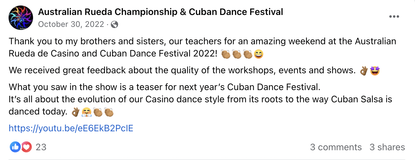At the same time, there is good reason to remain skeptical about the back-stepping habits in the forms of dancing associated with the labels Cuban Salsa and Timba portrayed as more recent and “evolved” by the Australian Rueda de Casino Championship organisers in 2022.