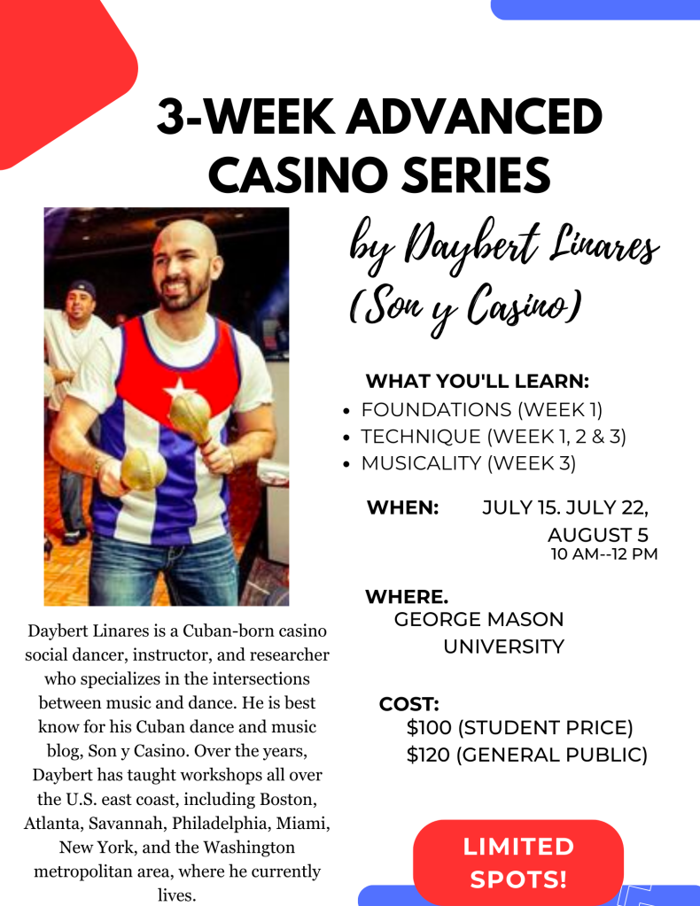 “Advanced” means that you will learn advanced concepts as we delve deep into technique and foundations. That said, this series assumes that you know how to dance casino. If you are just exploring the dance, this is likely not a workshop for you.